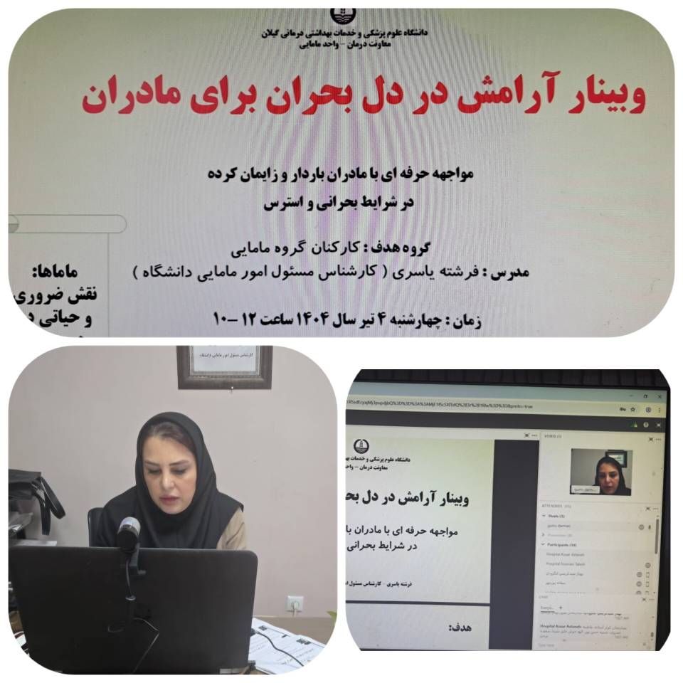 به همت واحد مامایی معاونت درمان دانشگاه علوم پزشکی گیلان، وبینار آموزشی با موضوع آرامش در دل بحران برای مادران بار دار و زایمان کرده برگزار شد.