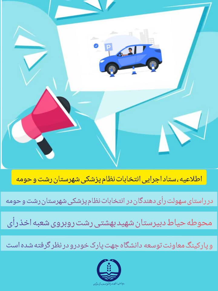 به گزارش روابط عمومی معاونت درمان دانشگاه علوم پزشکی گیلان ؛ ستاد اجرایی انتخابات نظام پزشکی شهرستان رشت و حومه اعلام کرد در راستای سهولت رأی دهندگان در انتخابات نظام پزشکی شهرستان رشت و حومه، محوطه حیاط دبیرستان شهید بهشتی رشت روبروی شعبه اخذ رأی و پارکینگ معاونت توسعه دانشگاه جهت پارک خودرو در نظر گرفته شده است.